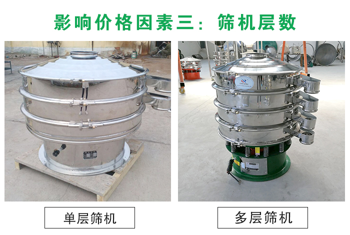 煙草振動(dòng)篩分機(jī)材可安裝1-5層篩網(wǎng),可同時(shí)進(jìn)行2~6個(gè)等級(jí)的分選或過濾,不同的層數(shù)有著不同的篩分目的,單層只能簡(jiǎn)單的篩分過濾,多層則可以完成分級(jí)除雜等篩分效果。安裝多層篩網(wǎng)的肯定會(huì)比單層篩網(wǎng)的貴一些。差價(jià)在1000元以上。